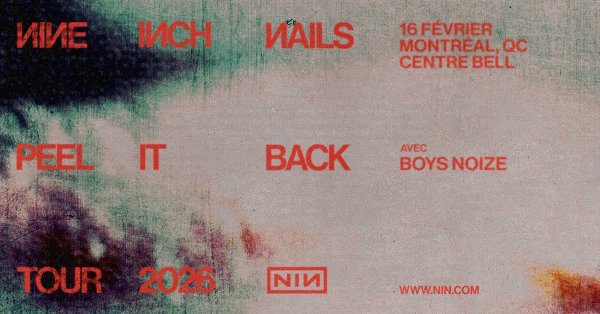 Le groupe métal Nine Inch Nails sera en spectacle au Centre Bell le lundi 16 février 2026 dans la cadre de sa tournée Peel it back 2026.
