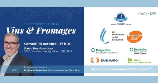 La Fondation du club Richelieu Québec-Ancienne Lorette vous invite à leur soirée annuelle, sous la formule d’un Vins et Fromages, le 18 octobre prochain. La soirée aura lieu au Patro Laval, sous la présidence d’honneur de M. Simon Beaudoin, Vice-président directeur général agroalimentaire de la firme Sani-Marc Inc.
